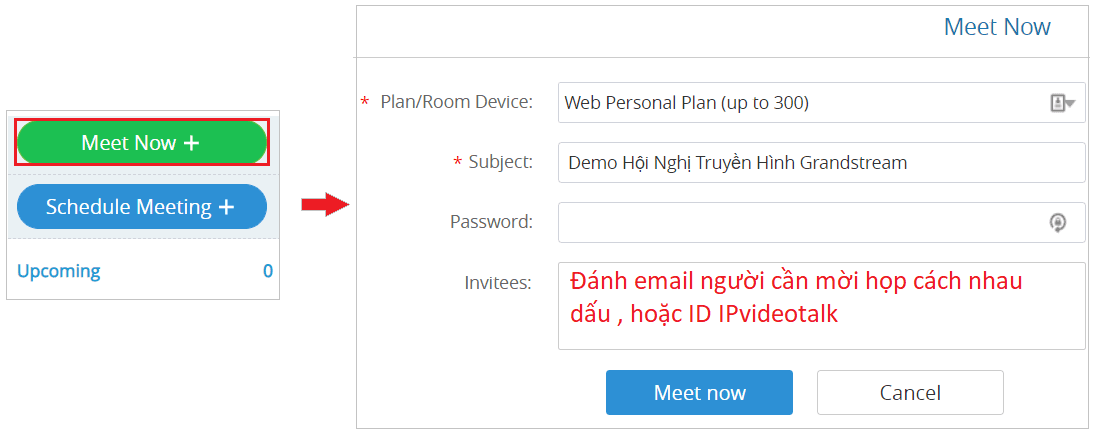 2/ Demo phần mềm hội nghị tryền hình trực tiếp trên WebSau khi đăng nhập như ở mục 1/ chúng ta có thể demo ngay trực tiếpa/ Chế độ tạo cuộc họp trực tiếp lên tới 50 điểm cầu truyền hình- Bấm vào "Meeting" -> bấm nút "Meet Now +" -> bấm tiếp nút Meet Now để thiết lập cuộc họp